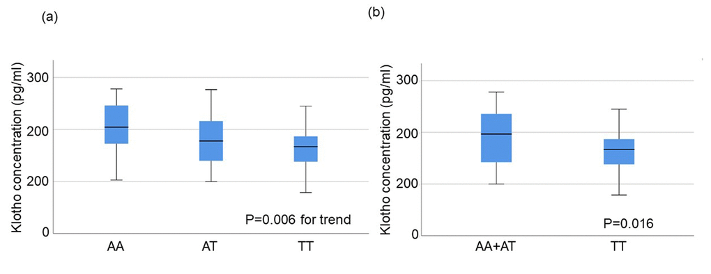 Twenty-nine individuals from each of three groups (AA, AT, TT) were randomly selected and plasma concentrations of klotho protein were measured for each individual. There was no difference in the background characteristics among the genotypes (Table 3). Median klotho concentrations and the interquartile ranges (IQR) were 204.4 (IQR:162.4.-248.7), 177.9 (IQR:138.5-217.4), and 166.9 (IQR:133.8-186.8) (pg/ml) in subjects with AA, AT, and TT genotypes, respectively. A Jonckheere-Terpstra test showed a significant trend of decreased plasma klotho concentration with increased number of T alleles in rs650439 (AA>AT>TT) p=0.006) (Figure 2a). Patients with the TT genotype had significantly lower plasma klotho concentrations than those with AA+AT. (p=0.016) (Figure 2b).