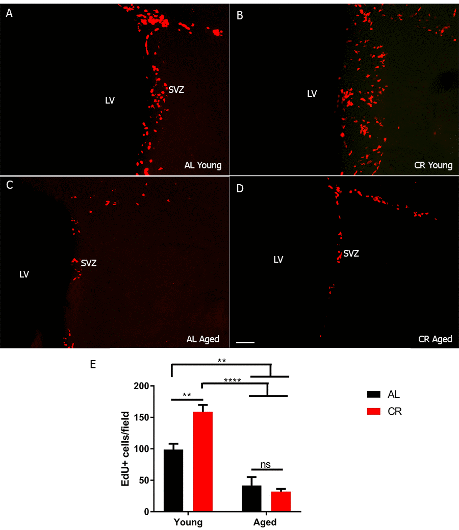 Calorie restriction was initiated at 14 weeks of age in a stepwise fashion with an initial 10% reduction of free feeding weight followed by a 25% reduction at 15 weeks and a 40% reduction at 16 weeks. Mice were maintained at a 40% reduction until euthanized at 6 months or 12 to 18 months. Age-matched controls were fed ad libitum, and maintained on a free feeding diet until sacrifice. We measured numbers of proliferating cells within the SVZ of young and aged mice fed either an ad libitum control diet or a calorie restricted diet by injecting mice with EdU and sacrificing them 2 hours later. SVZ proliferation was transiently enhanced in young calorie-restricted (CR) mice, but declined in aged mice, regardless of their feeding paradigm (Figure 1A-D), young ad libitum (AL) diet group: 98.8 ± 9.4, young CR: 159 ± 10.9, aged AL 41.7 ± 13.5, aged CR 32 ± 4.4, p < 0.05, F (1, 12) = 11.8). We detected no differences between male and female mice. This result suggests a temporally sensitive window during which calorie restriction can impact proliferation in the SVZ of aging mice.