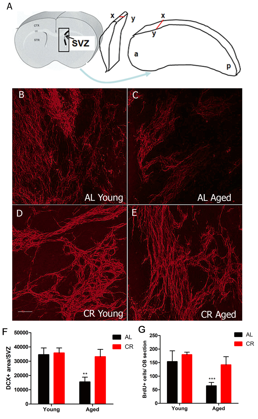 Neural stem cells from the SVZ give rise to a different population of neurons than hippocampal stem cells, are developmentally derived from a different source, and have a unique niche and regulatory signals [26]. Here we show that calorie restriction also has a differential effect on proliferation and neuron production of neural stem cells in the SVZ. Calorie restriction initiated in early adulthood prevented the age-related decline in neurogenesis, with more DCX+ neuroblasts in the SVZ and increased numbers of BrdU+ cells in the olfactory bulb of aged mice. In contrast, only young mice fed a calorie-restricted diet experienced increased proliferation of stem and progenitor cells in the SVZ, while aged mice showed a decline in this proliferation regardless of diet.