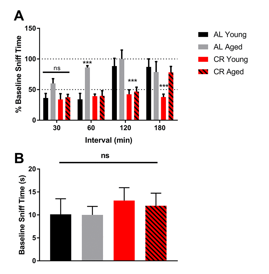 During the first 5-minute exposure, all mice, regardless of age or diet, spent the same amount of time sniffing the odor-containing probe, indicating that the baseline was similar among mice. In addition, there was no effect of novelty between trials or testing days (Figure 3B). These data indicate that olfactory memory was not only protected, it was enhanced in mice fed a CR diet.