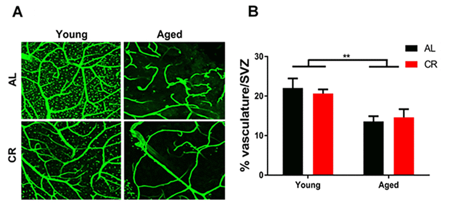 SVZ vascular density declined in all aged mice despite dietary intervention (Figure 4). This result suggests that the protective effects of calorie restriction are likely due to other modifiable factors in the microenvironment, such as inflammation, rather than by preserving vascular structure in the aging brain.