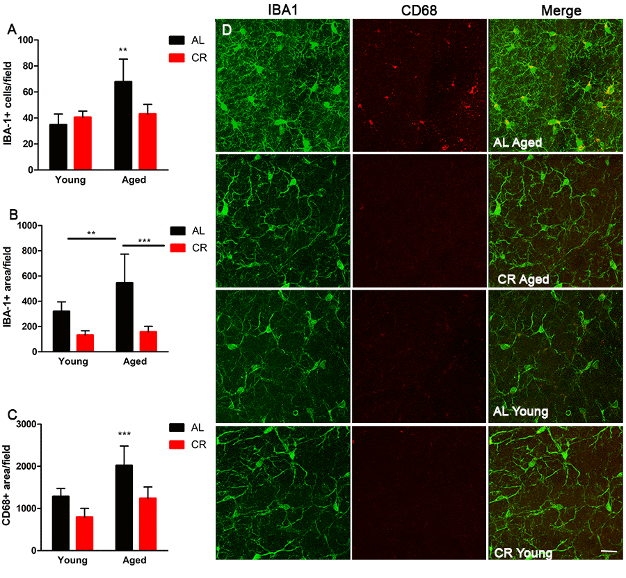 Data from male and female mice were combined for this report, since we observed no differences in key measurements, including microglia activation and neurogenesis. This strategy also allowed us to use fewer mice, since this colony of calorie-restricted mice has been discontinued and mice were in limited availability.