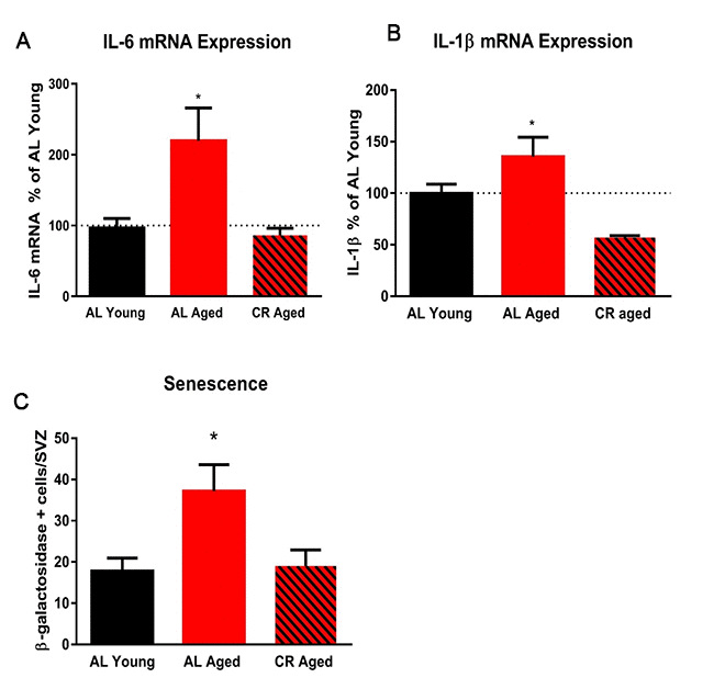 Calorie restriction exerts potent anti-inflammatory effects in peripheral tissues and can reduce levels of circulating inflammatory factors [33]. It also decreases inflammatory responses to lipopolysaccharide exposure [34] and lowers cytokine and C-reactive protein levels in the blood of rodents, non-human primates, and humans [35,36]. In particular, IL-6, a cytokine associated with senescence, is markedly reduced in aged calorie-restricted animals compared with aged ad libitum-fed animals [35,37,38]. In the present study, we have observed a neurogenic microenvironment in the SVZ with far fewer activated microglia, lower cytokine expression, and decreased senescence in aged calorie-restricted mice compared with ad libitum-fed counterparts. Our data showing decreased inflammatory and senescent markers add to the body of literature describing the anti-inflammatory effects of calorie restriction, and extend our current knowledge to include the protective effect of calorie restriction against inflammation in the SVZ neurogenic niche.