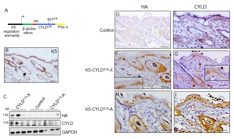 Figure 1. Analysis of the expression of the endogenous and the mutant CYLD protein in the K5-CYLDC/S mice. (A) Scheme of the construction used to obtain the K5-CYLDC/S mice. (B) Representative image showing the expression of K5 in the back skin of Control mice. Arrow: sebaceous gland; arrow head: ORS. (C) Analysis by WB of the expression of HA and CYLD in total protein extracts from the back skin of 30 day-old control and transgenic mice. Both lines of K5-CYLDC/S mice express higher levels of CYLD than Controls. HA was not detected in Control mice. GAPDH was used as a loading control. Immunostaining -with HA (D, F, H) and CYLD (E, G, I) antibodies- of back skin samples from Control (D, E) and transgenic (K5-CYLDC/S-X and K5-CYLDC/S-A) mice (F-G, H-I, respectively). HA is not expressed in Control mice (D). In the K5-CYLDC/S mice both, the expression of HA (F, H) and CYLD (G, I) follows the expression pattern of K5. Scale bars: 250μm (B); 150μm (D-I).