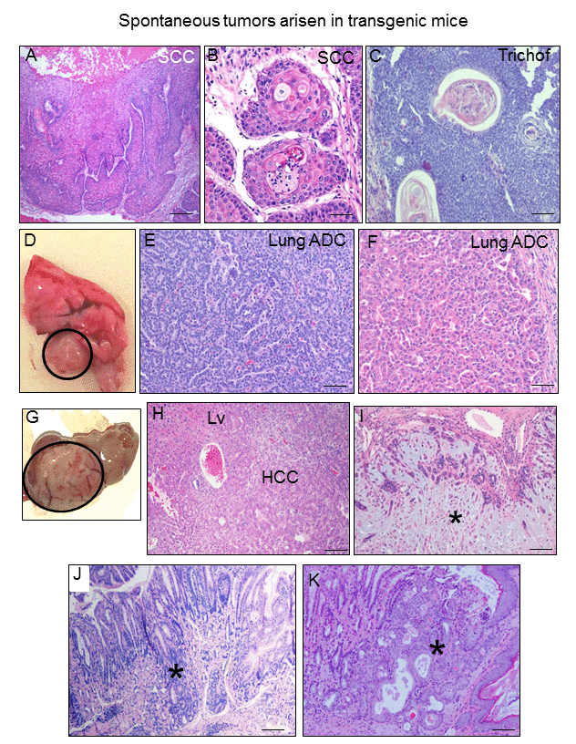 Figure 10. K5-CYLDC/S mice develop spontaneous tumors in many organs. (A-C) Skin tumors. Infiltrating SCC arisen in the back skin of 8-month-old transgenic mouse (A, B). (C) Hair follicle derived tumor (trichofolliculoma) developed in the snout of a K5-CYLDC/S mouse. (D) Macroscopic appearance of a lung adenocarcinoma. (E) Lung acinar adenocarcinoma. (F) Lung papillary adenocarcinoma. (G, H) Hepatocellular carcinoma (HCC); liver (Lv). (I) Mammary adenoepithelioma (asterisk). (J) Well differentiated gastric adenocarcinoma (asterisk). (K) In situ gastric carcinoma (asterisk). Scale bars: 500 μm (A); 300 μm (C, J, K); 200 μm (E, F); 250 μm (H, J); 100 μm (B).