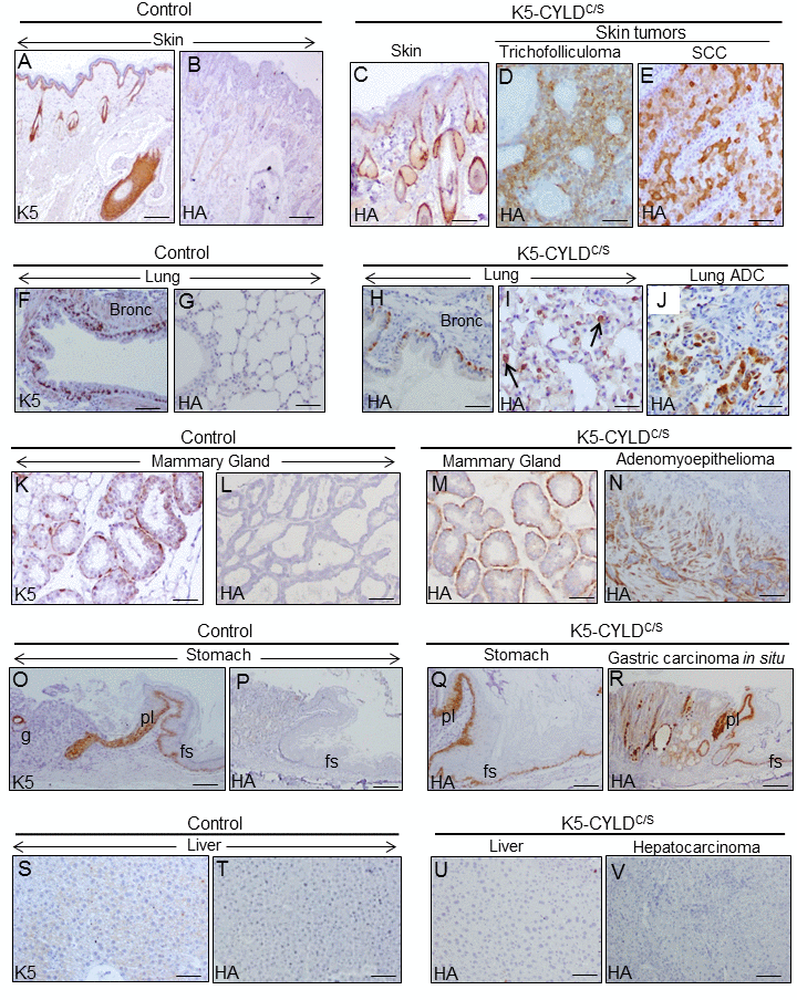 Figure 11. Analysis of the expression of the transgene in the tumors developed in the K5-CYLDC/S mice and in their matched non tumoral tissue. Immunohistochemical staining with K5 and HA antibodies. (A, B) Snout sections from Control mice. K5 expression in the basal layer of the epidermis, HF and the immature cells of the sebaceous glands (A); HA is not detected (B). (C) HA expression in the snout of transgenic mice following the K5 expression pattern. HA expression in the tricofolliculoma of the snout (D) and in the SCC of the back skin of K5-CYLDC/S mice (E). (F-G) K5 expression in the basal layer of the epithelium of bronchia and bronchioles of Control mice (F); no HA staining was observed (G). (H, I) HA in bronchia and bronchioles of transgenic mice (H) and in alveolar cells (I). (J) HA expression in the lung ADC. (K, L) K5 expression in the myoepithelial cells around the mammary secretory acini of Control mice (K); HA is not detected (L). (M) HA in the mammary secretory acini of lactating transgenic mice following the K5 expression patter. (N) HA expression in the mammary adenomyoepithelioma. (O, P) Stomach from a Control mice showing K5 expression in the aglandular epithelia (forestomach, fs), plica (pl), and in scattered glands (g) (O); HA is not expressed (P). (Q) Expression of HA in the stomach of transgenic mice following the K5 expression pattern. (R) Gastric carcinoma in situ expressing HA. (S, T) Neither K5 nor HA are expressed in the liver of Control mice. (U) HA is not detected in hepatocytes of K5-CYLDC/S mice. (V) HA is not expressed in the hepatocarcinomas (HCC) of transgenic animals. Scale bars: 300 μm (A-C; N, R); 150 μm (D, E, I, J); 70 μm (K-M); 250 μm (G, O, P); 200 μm (F, H, Q, V); 100 μm (S-U). ADC: adenocarcinoma.