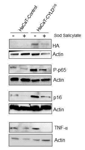 Figure 12. The reduction of the NF-κB overactivation in keratinocytes expressing the CYLDC/S mutant decreases the expression of the biomarker of aging p16 and TNFα. HaCaT (Control and CYLDC/S) cells were treated with sodium salicylate for 48h when indicated (+). WB shows that HaCaT-CYLDC/S cells exhibit increased levels of expression of P-p65, p16 and TNFα, but the treatment with sodium salicylate, which reduced P-p65 levels, also decreases p16 and TNF-α levels in these cells. Actin was used as a control loading.