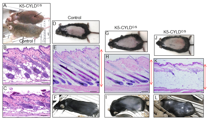 Figure 2. Analysis of the hair regrowth in Control and K5-CYLDC/S mice. (A) Representative image of the patches of diffuse alopecia (arrows) of the transgenic mice (7-month-old mice are shown). (B, C) Representative images of the skin of 1-month-old mice. (D-L) Representative images of a hair growth experiment. The back of 7-week-old mice was shaved and the skin was collected 16 days after depilation. (D-F) Hair regrowth in Control mice. (G-L) Hair regrowth in the K5-CYLDC/S mice. (D, G, J) Representative images of freshly depilated mice of the corresponding phenotypes (day 0 of the experiment). (E, F) 16 days after shaving Control HFs were in the anagen-catagen I phase (E) and mice exhibited a homogeneous hair regrowth (F). (H) Histology showing initiation of the anagen phase of the hair cycle 16 days after shaving the back of a transgenic mouse. The macroscopic view of this mouse showed that hair was very short and hardly visible (I). (K) Histology of a section of the back skin of a K5-CYLDC/S mouse showing a delay in the growth of the new hair, so that 16 days after shaving it still remains in the telogen phase. (L) Macroscopically these areas correspond to those lacking hair in the back skin of the transgenic mouse (white asterisks). Red arrows show differences in the thickness of the skin between Control (E) and transgenic mice (H, K). Scale bars: 280 μm.