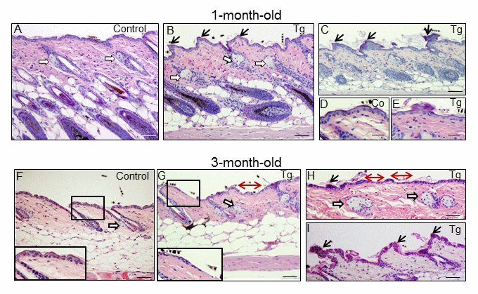 Figure 3. Histological alterations in the back skin of 1 and 3-month-old K5-CYLDC/S mice. (A-E) Histology of the back skin of 1-month-old Control (A, D) and K5-CYLDC/S mice (B, C, E). (A) Observe small sebaceous glands (white arrows) and HFs in the anagen phase in Control mice. (B, C) Note in transgenic mice the presence of moderately hyperplastic sebaceous glands, epidermal ridges and HFs initiating the anagen phase of the second hair growth cycle. (D, E) Slight thinning of the epidermis of K5-CYLDC/S mice. (F-I) Histology of the back skin of 3-month-old Control (F) and K5-CYLDC/S mice (G-I). (F) Note small sebaceous glands and telogenic HFs in Control mice. (G-I) Observe marked epidermal atrophy; abundant epidermal ridges of pyknotic keratinocytes, increased hyperplasia of the sebaceous glands and areas with orphan sebaceous glands lacking hair follicles in transgenic mice. White arrows: sebaceous glands; black arrows: epidermal ridges of pyknotic keratinocytes; double-headed red arrows: areas of epidermal atrophy. Scale bars: 250 μm (C, F-H); 200 μm (A, B); 180 μm (I); 150 μm (D, E).