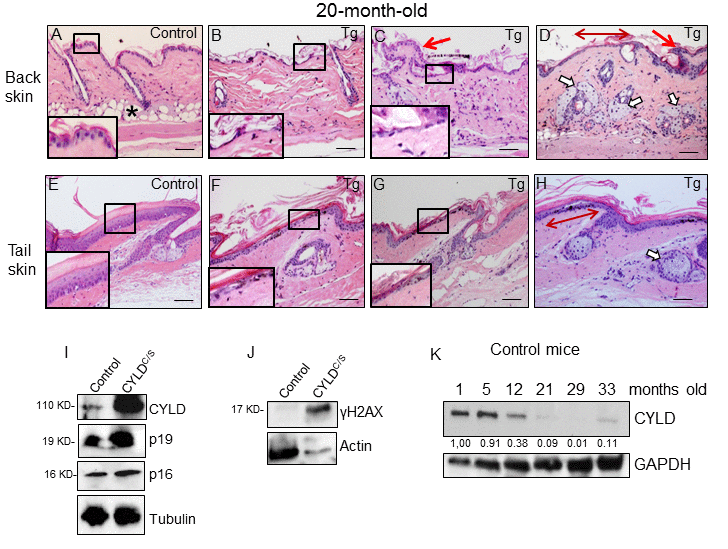 Figure 5. Histological and molecular signs of premature aging in the back skin of transgenic mice. (A-H) Representative histological images showing the back skin of 20-month-old Control mice (A) and the severe aging phenotype of the back skin of 20-month-old transgenic mice (B-D). (B-D) Note severe epidermal atrophy (compare insets in A with those of B and C; double-headed red arrow in D); foci of papillomatous hyperplasia (red arrows in C and D); numerous hyperplastic sebaceous glands, most of them orphan and grouped in the dermis (D); reduced number of HFs, and scarce or even lack of adipose tissue (compare A with B-D) in the back skin of the K5-CYLDC/S mice. (E-H) Tail skin of Control (E) and transgenic (F-H) mice. Note the presence of hyperplastic sebaceous glands and extensive epidermal atrophy (compare inset in E with those in F and G) in the tail of the K5-CYLDC/S mice. (I, J) WB of total protein extracts from skin of 12-month-old (I) and 6-month-old (J) showing elevated levels of p16, p19 and γH2AX in the K5-CYLDC/S mice. Tubulin and Actin are used as control loading. (K) WB of total protein extracts from the skin of Control mice from 1 to 33 months of age showing the decreased expression of CYLD as mice age. GAPDH is used as a control loading. White arrows: sebaceous glands; red arrows: papillomatous hyperplasia; double-headed red arrows: areas of epidermal atrophy. Scale bars: 250 μm (A-D); 200 μm (E-H).