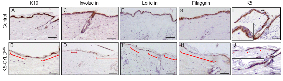 Figure 6. Deficient differentiation in the skin of K5-CYLDC/S mice. Representative immunostainings of the back skin of 20-month-old mice (A-J). Observe the strong expression of the epidermal differentiation proteins Involucrin, Loricrin and Filaggrin in the suprabasal layers of the epidermis of Control mice (A,C,E,G); and the weak and discontinuous expression of these proteins in the epidermis of K5-CYLDC/S mice (B,D,F,H), specially faint in the areas of epidermal atrophy (red brackets). (I, J) Representative images corresponding to the immunostaining of the back skin of Control (I) and transgenic (J) mice with the K5 specific antibody. (I) Strong K5 staining in basal keratinocytes of Control mice. A faint and patched expression is detected in the epidermis of the transgenic mice, especially in the regions of atrophic epidermis (indicated by red brackets). Scale bars: 180 μm (A-H); 150 μm (I, J).