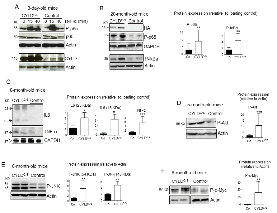 Figure 7. Overactivation of the NF-κB, and other pro-aging pathways, along with increased IL6 and TNF-α expression in the skin of the K5-CYLDC/S mice. (A) p65 and IκBα phosphorylation kinetics in the back skin of 3-day-old Control and transgenic mice treated with TNF-α for the indicated times. (B) WB showing over-activation of the classical NF-κB signaling pathway (P-p65 and P-IκBα) in the skin of 20-month-old transgenic mice. (C) Increased expression of the inflammatory cytokines TNF-α and IL6 in the skin of the K5-CYLDC/S mice. (D-F) WB showing the hyperactivation (phosphorylation) of Akt (D), JNK (E) and c-Myc (F) in the skin of adult K5-CYLDC/S mice. Graphic representations of the densitometric analysis of western blots corresponding to extracts from 5-7 animals of each genotype are shown. Mann-Whitney U test was used for statistical analysis. (*p<0.05; **p<0.01; ***p<0.001).