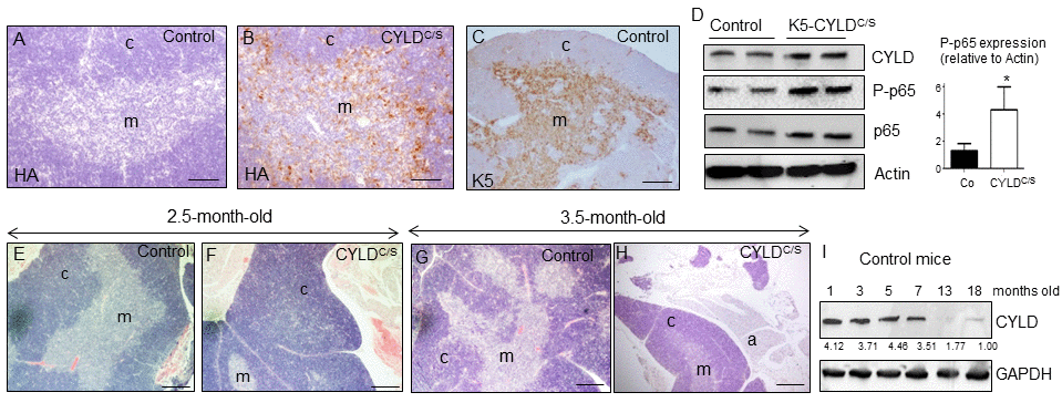 Figure 8. Premature thymic involution and over-activation of NF-κB in the thymus of K5-CYLDC/S mice. (A-C) Analysis of the expression of the transgene by immunostaining with a specific antibody against the HA tag. Expression of HA is detected in the medulla of the thymus of the K5-CYLDC/S mice (B), following the expression pattern of the K5 (C), while it is not detected in the Controls (A). (D) Analysis by WB of the expression of the transgene in protein extracts from isolated thymic cells of mice of 3.5-month-old. Note the overactivation of NF-κB (increased levels of P-p65) in the K5-CYLDC/S mice. Mann-Whitney U test was used for statistical analysis. (*p<0.05). (E, F) Histological analysis of the thymus of 2.5-month-old mice. Observe the expansion of the cortical zone and reduction of the medullar region in the thymus of transgenic mice (F). (G, H) H&E staining of 3.5-month-old Control (G) and K5-CYLDC/S mice (H) thymus. A representative image of the thymic atrophy and infiltration of white adipose tissue in the thymus of transgenic mice (H) is shown. (I) Western blot showing the decreased expression of CYLD with age in the thymus of control mice. M, medulla. C, cortex. a, adipose tissue. Scale bars: 200 μm (A, B); 300 μm (C); 350 μm (E-H).