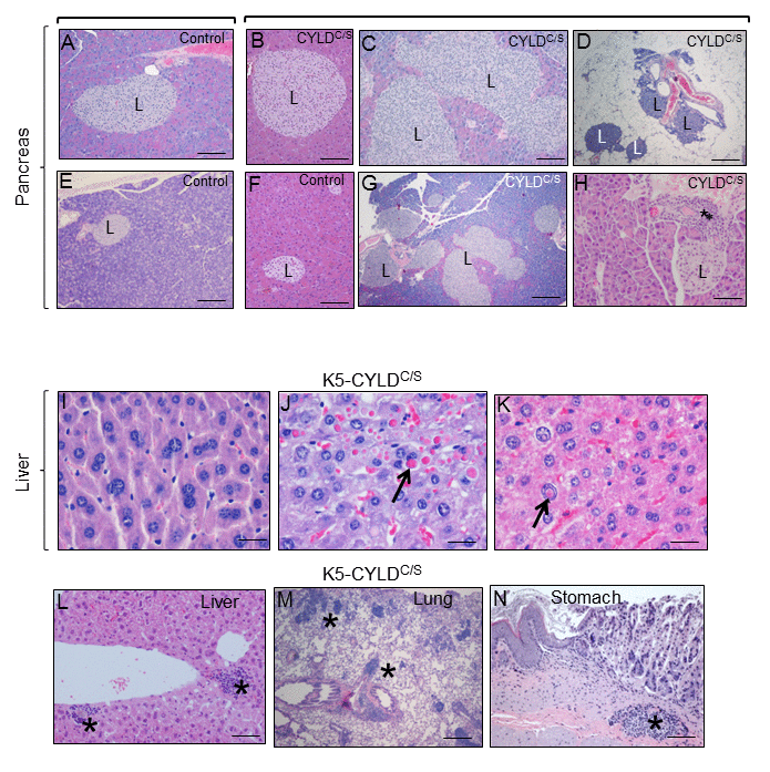 Figure 9. Alterations found in the pancreas, liver, lung and stomach of the K5-CYLDC/S mice suggestive of early aging of the K5-CYLDC/S mice. (A-H) Histopathologic analysis by H&E staining of pancreas from 5-month-old (B, F) and 12-month-old Control and transgenic mice. (A, E, F) Pancreas from Control mice: note the presence of Islets of Langerhans (L) of heterogeneous but moderate size. (B-D; G, H) Histology sections representatives of pancreas from K5-CYLDC/S mice. Note the hyperplasia of the Islets of Langerhans (B, C, G, H). (D) Extrapancreatic location of the Islets of Langerhans, in the peripancreatic fat, observed in the K5-CYLDC/S mice. (H) Foci of inflammation (asterisk) in the pancreas of K5-CYLDC/S mice. (I-N) Histopathological analysis of liver, lung and stomach sections from different organs of 20-month-old K5-CYLDC/S mice. (I-K) Representative images showing anisokariosis (I), eosinophilic intracytoplasmic inclusions (arrow in J), intranuclear eosinophilic inclusions (arrow in K), and inflammation foci (asterisks in L) in the liver. (M) Example of inflammation foci observed in the lung. (N) Stomach with an inflammation focus. The pancreas of 4 Control and 4 transgenic mice of 5- and 12-month-old were analyzed. Number of animals whose liver, lung and stomach has been analyzed is showed in Table 1. Asterisks: Inflammation. Scale bars: 250 μm (A, B, D-F); 350 μm (C); 500 μm (G); 150 μm (H; L-N); 40 μm (I-K).