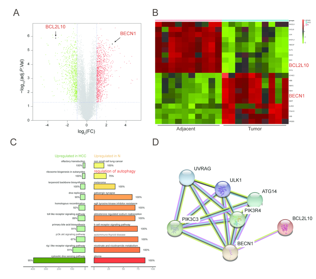 To summarize, in this study, the expression of BCL2L10 and BECN1 in hepatoma cells and their effects on the autophagy of hepatoma cells was observed. BCL2L10 had a low expression in HCC tissues and cells, which could combine with BECN1 to induce autophagy of hepatoma cells. PI3K/AKT signaling pathway was involved in the regulation of autophagy by BCL2L10/ BECN1, which could be safely concluded from our bioinformatics analysis. A limitation of this study was that we only researched one cell line. Hence, there is a possibility that other elements could affect the results of our study. Further examinations should be needed to clarify the roles of BCL2L10 and BECN1 in HCC by means of including more cell lines such as HepG2 and HCC-LM3. Though our results may be impacted by the small sample size, they can still provide impactful ideas for the development of liver cancer therapy.