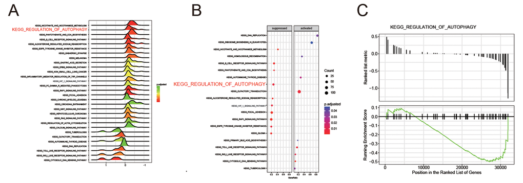 All differential expression genes (DEGs) from GPL570 platform/ GSE49515 series were under the |log2FC| > 2 and adjusted P < 0.05 level of limma. Through differential genes expression analysis, expression of 1892 mRNAs showed significant difference where 947 were upregulated and 945 downregulated, including BCL2L10 and BECN1 (Figure 1A). The top 20 up- and down- regulated mRNAs were shown in Figure 1B. Then, we conducted KEGG pathway analysis based on HCC-related DEGs and obtained the 10 top and down scored pathways according to the enrichment scores from GSEA report (Figure 1C). Meanwhile, the consequence of STRING analysis on BCL2L10 / BECN1 related pathways were displayed in Figure 1D. After crosschecking those consequences, we narrowed down our interesting pathways into one mutual option, the regulation of autophagy pathway, which was suppressed in HCC. Thus, we speculated that hepatoma cell autophagy could be influenced by either BCL2L10 or BECN1. Based on the fold change value of each pathway, the distribution of several KEGG pathways were drawn in joyplot and dotplot (Figure 2A-2B). To summarize, the autophagy pathway was upregulated in HCC (Figure 2C).