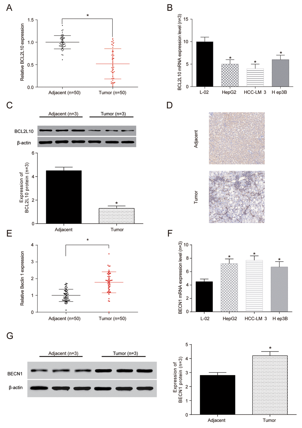 The expression of BCL2L10 was low but BECN1 was high at mRNA and protein level in HCC tissues and cells