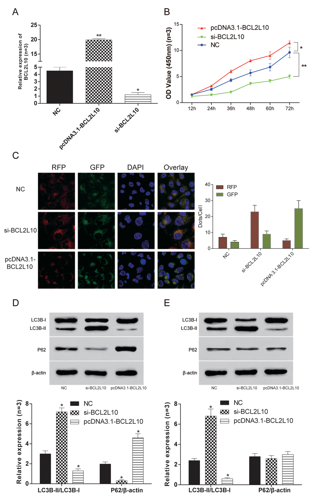 Hep3B HCC cells with the highest expression level of BCL2L10 were selected for the subsequent experiments. The expression level of BCL2L10 in three different groups was verified by qRT-PCR (Figure 4A). Then loss-of-function and gain-of-function experiments were performed to detect the effect of BCL2L10 on autophagy, and the protein level of it was examined by western blot (Supplementary Figure 1A-B), as well as that of BECN1 (Supplementary Figure 1C-D). The cell viability of si-BCL2L10 group was the weakest (P<0.05), while the cell viability of pcDNA3.1-BCL2L10 group was the strongest (P<0.05) (Figure 4B). The autophagy flux was observed under fluorescence microscope (Figure 4C). Compared with NC group, the expression of LC3B-II/LC3B-I in pcDNA3.1-BCL2L10 cells was decreased. In contrast, the expression of LC3B-II/LC3B-I in si-BCL2L10 cells was increased, which indicated that the overexpression of BCL2L10 suppressed the autophagy of hepatocarcinoma cells (P<0.05, Figure 4D). To test whether BCL2L10 influenced autophagic flux, we also evaluated the expression of P62. Indeed, knockdown of BCL2L10 inhibited autophagic P62 degradation (P<0.05, Figure 4D). Accumulation of LC3B-II was also observed in the presence of Bafilomycin A1 (an inhibitor of late-phase autophagy) (P<0.05, Figure 4E), while P62 expression was little decreased in Hep3B cells with BCL2L10 overexpression (P>0.05, Figure 4E). BCL2L10 overexpression failed to lead to decrease in P62 protein level in the presence of Bafilomycin A1, which indicates that autophagic degradation of P62 was blocked by Bafilomycin A1.