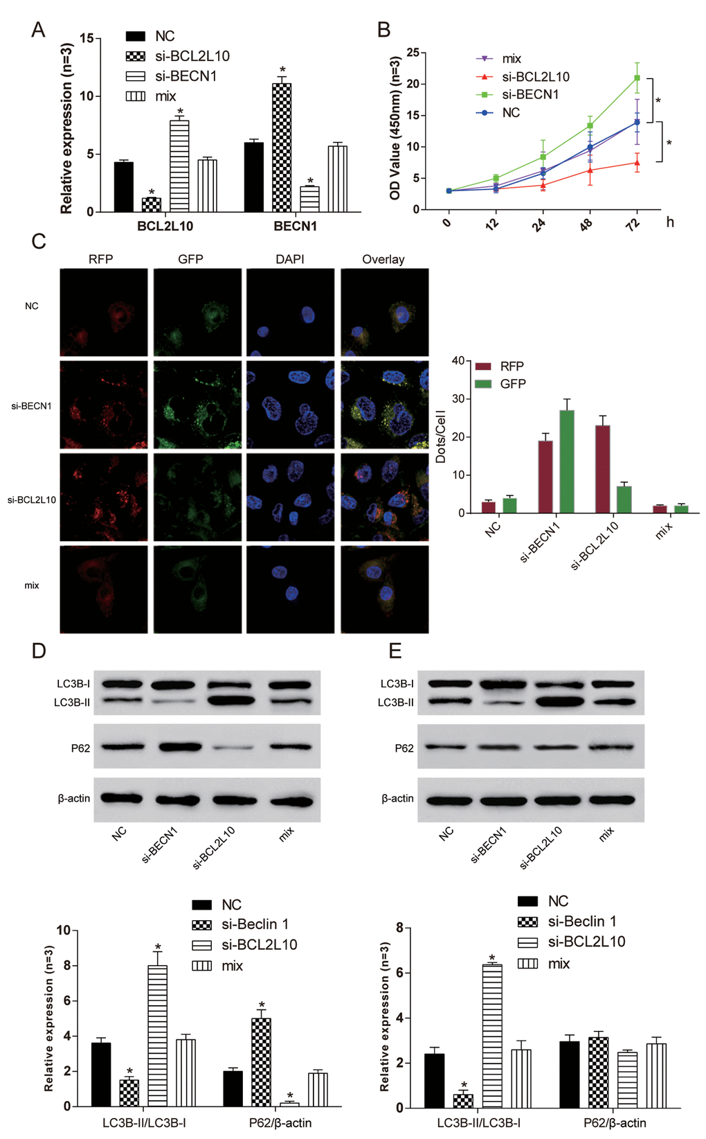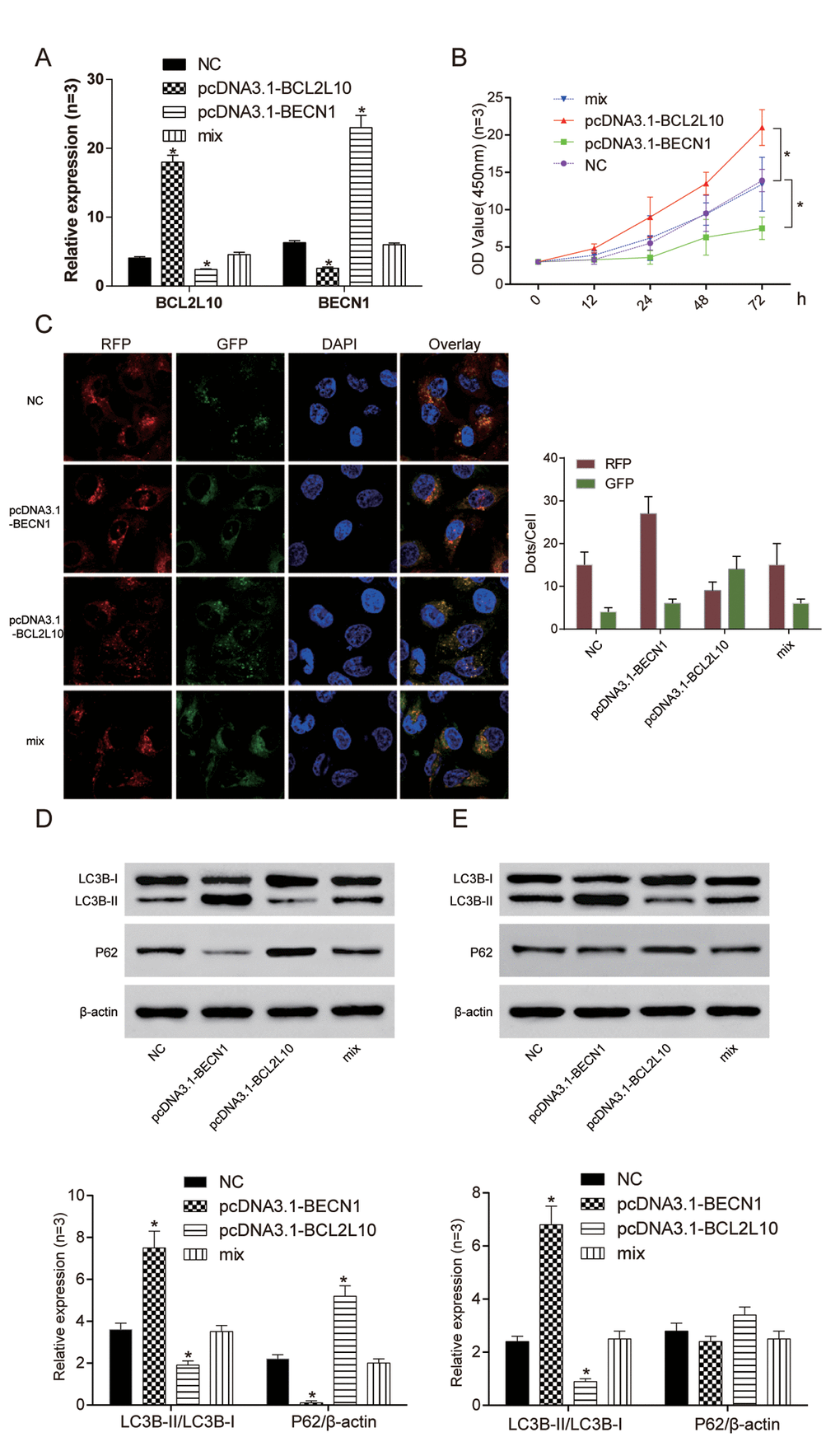 In order to study BECN1 when BCL2L10 inhibited the autophagy of hepatocarcinoma cells, we transfected pcDNA3.1-BECN1 and pcDNA3.1-BCL2L10 into Hep3B cell line. The expression levels of BCL2L10 and BECN1 in four different groups were verified by qRT-PCR (Figure 6A). The cell viability of pcDNA3.1-BECN1 group was the weakest (P<0.05), and the cell viability of pcDNA3.1-BCL2L10 group was the strongest (P<0.05, Figure 6B). Moreover, overexpression of BECN1 indicated autophagy induction in HCC cells as detected by immunofluorescence (Figure 6C). The expression of LC3B-II/I and P62 were detected with the absence of Bafilomycin A1 by Western Blot. The expression of LC3B-II/LC3B-I in pcDNA3.1-BCL2L10 cells was decreased compared with NC group (P<0.05). On the contrary, the expression of LC3B-II/LC3B-I in the pcDNA3.1-BECN1 group was increased (P<0.05). There was no significant difference in the expression of LC3B-II/LC3B-I between the NC group and mix group (P>0.05). The changes of P62 had a contrary trend with changes of LC3B-II/LC3B-I (P<0.05, Figure 6D). Little degradation of P62 was observed in the presence of Bafilomycin A1 (an inhibitor of late-phase autophagy) (P<0.05, Figure 6E), while LC3B-II expression was decreased in Hep3B cells with pcDNA3.1-BCL2L10 transfection (P>0.05, Figure 6E). It suggested that the overexpression of BCL2L10 inhibited autophagy of hepatocarcinoma cells by downregulating BECN1, whereas overexpression of BECN1 prevented BCL2L10 from inhibiting autophagy.