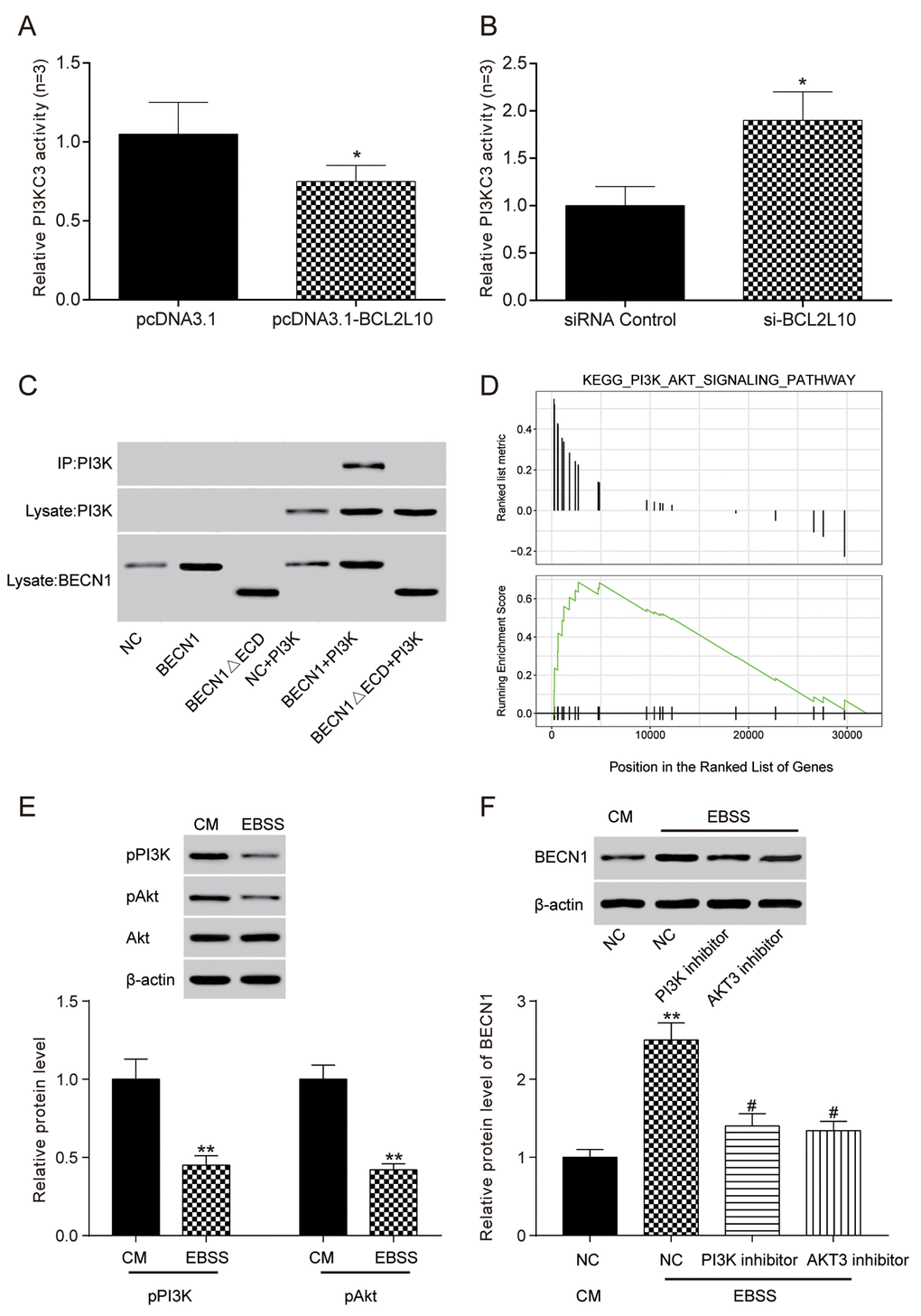 ELISA was adopted to detect compounds related to BECN1. After the overexpression of BCL2L10, the relative activity of PI3KC3 kinase was decreased (P<0.05, Figure 8A), and the relative activity of PI3KC3 kinase was increased after inhibiting the expression of BCL2L10 (P<0.05, Figure 8B). The above results demonstrated that BCL2L10 could reduce the binding between Beclin 1 and PI3KC3 kinase. To further confirm the BCL2L10-BECN1-PI3KC3 complex in autophagy, we performed co-immunoprecipitation assay using BECN1ΔECD that was reported to destroy the BECN1-PI3KC3 complex by Furuya et al. [16]. The result illustrated that PI3KC3/Vps34 lost its ability to bind to BECN1ΔECD, indicating the importance of the BECN1 ECD domain for its interaction with PI3KC3 (Figure 8C).
