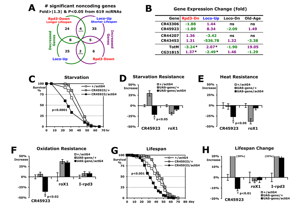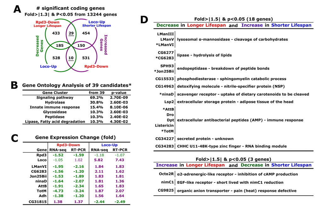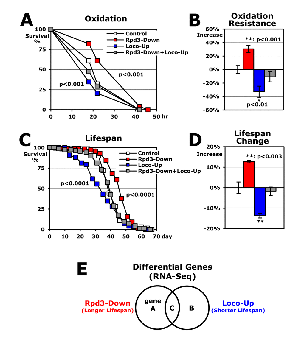 To investigate whether the nuclear protein Rpd3 interacts with the cytoplasmic membrane-associated protein Loco for the longevity regulation, here, we measured stress resistance and lifespan with a combination of the rpd3 downregulation to extend lifespan [5,6] and the loco upregulation to shorten lifespan [19]. Then, we examined gene expression profiles between those flies in order to find the common target genes modulated by Rpd3 and Loco for the longevity.