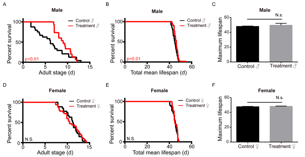 To determine the effect of metformin on their lifespan, silkworms were fed fresh mulberry leaves with or without metformin. Our results show that male silkworms treated with metformin lived longer than the untreated control. Both the adult lifespan and the total mean lifespan of the male silkworm treated with metformin were significantly prolonged, though there was no increase in maximal lifespan. In addition, metformin had no significant effect on adult, total mean, or maximum lifespan in female silkworms (Figure 1A-F). The total mean and adult lifespans of the male silkworm were elongated by 1.2 days (2.68%) and 0.99 days (9.45%), respectively, as compared to control (Figure 1D, E). The metformin dose used was relatively low. It may be that a higher dose would elongate the lifespan of female silkworms. Alternatively, it may be that a sex-specific regulator is involved in the process of lifespan regulation in these animals.
