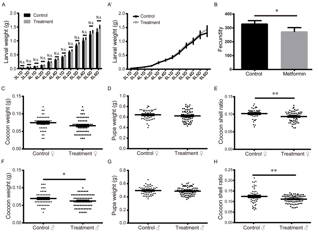 Commercial preparations of metformin were obtained from the Sigma-Aldrich (St. Louis, MO, USA). A 10-mM stock solution of metformin was prepared in sterile deionized H2O. After sterilization by filtration through 0.22 μm membranes, the stock solution was diluted to final concentrations of 0.1 mM, and stored at 4 °C. Each silkworm was fed mulberry leaves with 5μl 0.1 mM metformin (treatment group) or deionized water (control group).