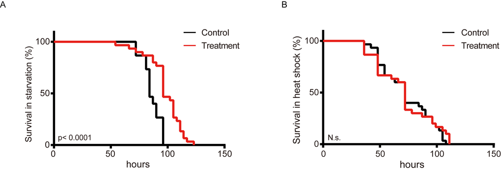 Lifespan elongation is associated with amplified stress resistance in many organisms [33-36]. To determine whether metformin exerts protect effects against nutritional and thermal stress, metformin-treated and control silkworms were subjected to fasting and thermal stress (Figure 3A, B). The results show that metformin obviously increased the survival rate (by 13.46%) of silkworms subjected to feeding stress (Figure 3A), but did not increase thermotolerance (Figure 3B).