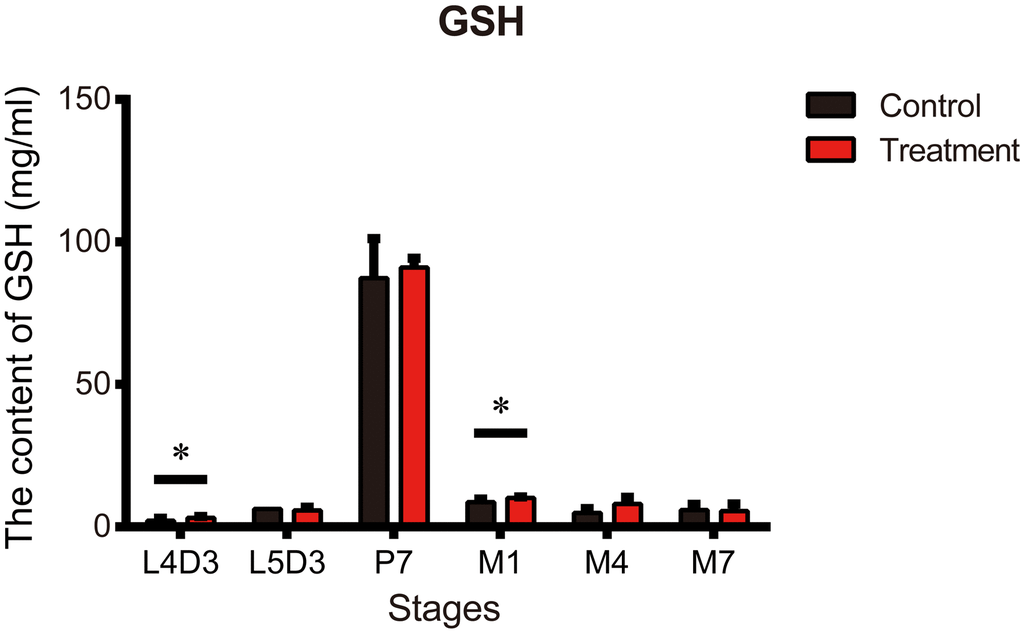 Metformin may also exert ergogenic effects that enhance the protective effects of an organism’s defense against attacks, leading to beneficial effects on lifespan [37]. Previous research suggests metformin may suppress cellular oxidative stress [15]. We therefore assessed the antioxidant activity of metformin in silkworms. GSH content is generally accepted as a crucial indicator antioxidative capacity. The GSH content of silkworms in the treatment group was significantly higher than in untreated controls on day 3 of the 4th instar larva (L4D3) and day 1 of the adult stage (M1) (Figure 4). On the other hand, GSH content did not differ between the groups on day 3 of the 5th instar larva (L5D3), day 7 of the pupal stage (P7), day 4 of the adult stage (M4), and day 7 of the adult stage (M7) (Figure 4).