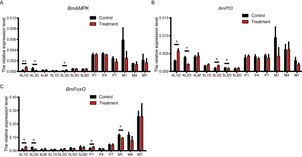 Silkworms in the control and treatment groups were obtained from day 1 or 3 of the 4th instar to day 7 of the moth stage. Total cellular RNA was isolated from three individuals using a rapid extraction Total RNA Kit (BioTeke Corporation, Beijing) according to the manufacturer’s instructions. First strand cDNA was synthesized from the total RNA samples using a PrimeScript™ RT Reagent Kit with gDNA Eraser (TaKaRa, Japan). RT-qPCR was performed using a CFX96 RealTime System (Bio-Rad, USA) with iTaq Universal SYBR Green Supermix (Bio-Rad, USA). Eukaryotic translation initiation factor 4A (BmMDB probe ID sw22934) is an optimally stable gene in silkworm [43]. Primer pairs targeted regions of the reference gene sw22934, BmAMPK, Bmp53, and BmFoxO specifically, and the relative expression levels of each gene were normalized to sw22934 and calculated as 2-△△CT [9]. The primers used for RT-qPCR are shown in Table 1. The qPCR conditions followed the manufacturer’s instructions.