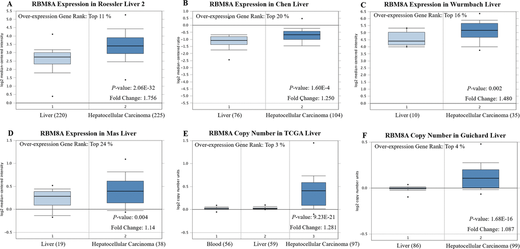 The mRNA expression and DNA copy number of RBM8A in HCC were analyzed within the Oncomine 4.5 database. Oncomine (www.oncomine.org), currently the world’s largest oncogene chip database and integrated data mining platform, contains 715 gene expression data sets and data from 86,733 cancer tissues and normal tissues [56]. This analysis drew on a series of HCC studies, including Roessler Liver 2, Chen Liver, Wurmbach Liver, Mas Liver, TCGA Liver and Guichard Liver studies [25–29]. RBM8A expression was assessed in HCC tissue relative to its expression in normal tissue, and differences associated with p < 0.01 were considered significant.