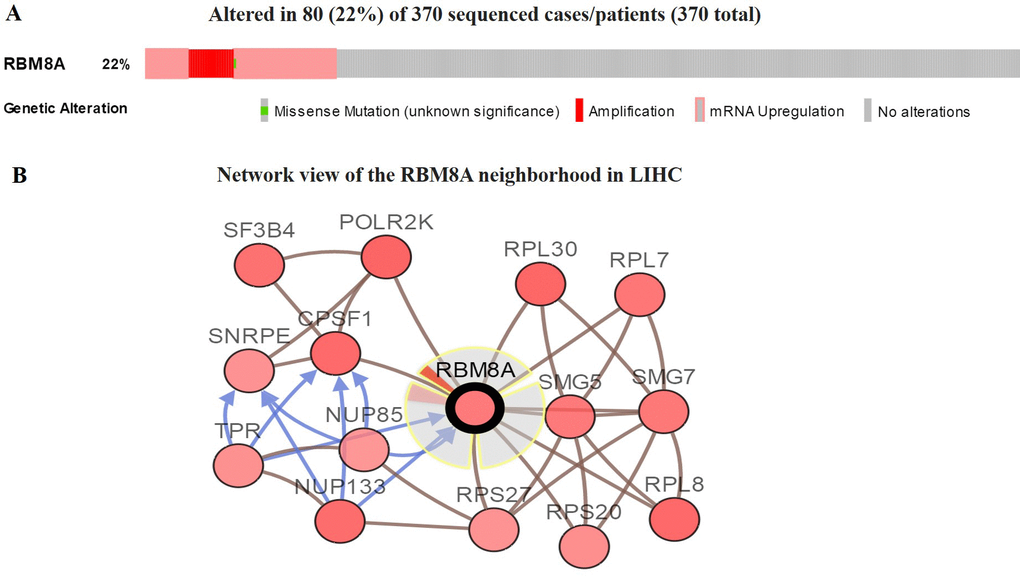 These results suggest that RBM8A is a novel proto-oncogene. Thus, we studied RBM8A expression and mutations in data from patients with HCC in The Cancer Genome Atlas (TCGA) and various public databases. Using multi-dimensional analysis methods, we analyzed genomic alterations and functional networks related to RBM8A in HCC. Thus, our results could potentially reveal new targets and strategies for HCC diagnosis and treatment.