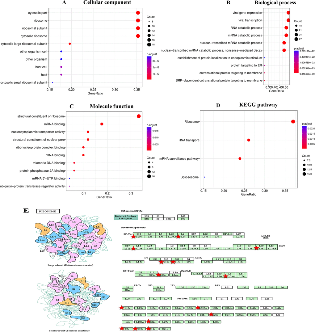 We next wanted to determine the biological interaction network of RBM8A in HCC. To do this, we used the tab Network in cBioPortal to show RBM8A-neighboring genes that were altered at frequencies >20% (Figure 3B and Table 1). The neighbor genes of RBM8A with the most frequent alterations were POLR2K (40.7%), RPL30 (38.8%) and CPSF1 (37.2%). The 50 most frequently altered neighbor genes were determined using Network. Analysis of significantly enriched gene ontology (GO) terms indicated that these genes encode proteins localized mainly to the cytosol, ribosome, and ribosome subunits. These proteins are primarily involved in viral gene expression and RNA catabolism, while they also serve as structural constituents of ribosomes and mRNA binding (Figure 4A–4C). Similarly, Kyoto Encyclopedia of Genes and Genomes (KEGG) pathway analysis showed enrichment in ribosome signaling, RNA transport, mRNA surveillance and spliceosome signaling pathways (Figure 4D, 4E). Thus, the biological interaction network of RBM8A alterations is involved in the ribosome and several RNA metabolic processes.