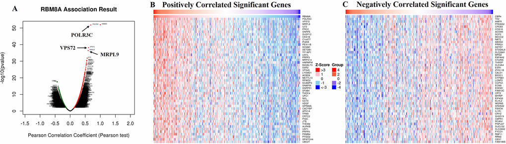 This study provides multi-level evidence for the importance of RBM8A in hepatocarcinogenesis and its potential as a marker in HCC. Our results suggest that RBM8A overexpression in HCC has far-reaching effects in genomic stability and at multiple steps of gene expression (DNA replication, RNA splicing and protein translation) and of the cell cycle. RBM8A is specifically related to several tumor-associated kinases (such as ATR), miRNAs (such as miRNA-363), and transcription factors (such as E2F1). This study uses online tools based on the most popular bioinformatics theories to perform target gene analyses on tumor data from public databases. Compared with traditional chip screening, this method has the advantages of large sample size, low cost, and simplicity. This enables large-scale HCC genomics research and subsequent functional studies.