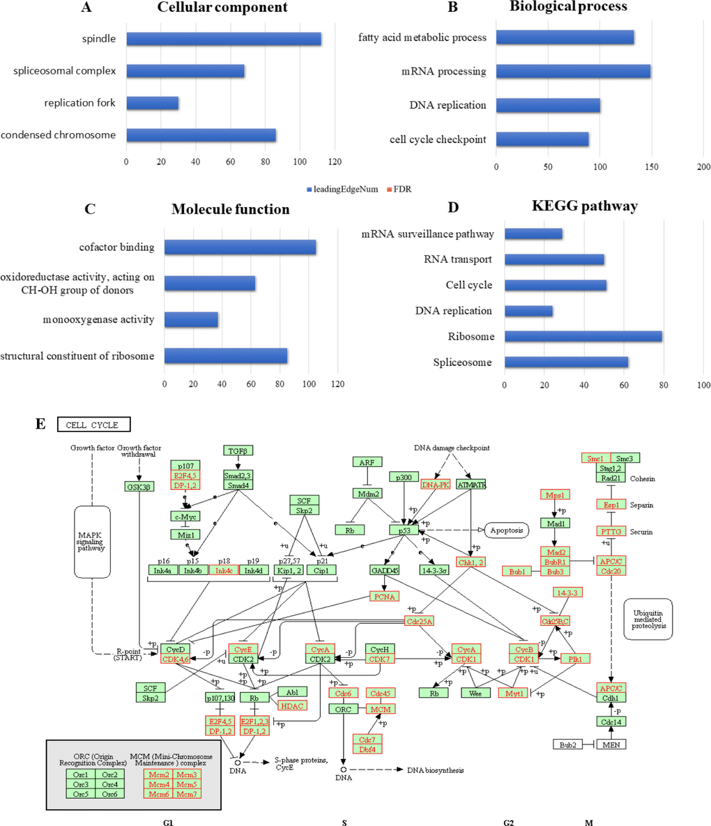 Enrichment analysis of target gene sets using GSEA can help reveal important networks of target kinases, miRNAs and transcription factors. Our results suggest that the functional network of RBM8A participates primarily in the spliceosome, ribosome, DNA replication and cell cycle. Like the mutation network, the functional network of RBM8A transcription is involved in genomic stability, gene expression and the cell cycle. These findings are consistent with the fact that RBM8A is critical for efficient and faithful splicing of a specific subset of short introns in mitotic cell cycle-related genes [32]. It is critical to understand how alteration in a protein important for ensuring normal transcription can lead to major dysfunction and even to cancer such as HCC.