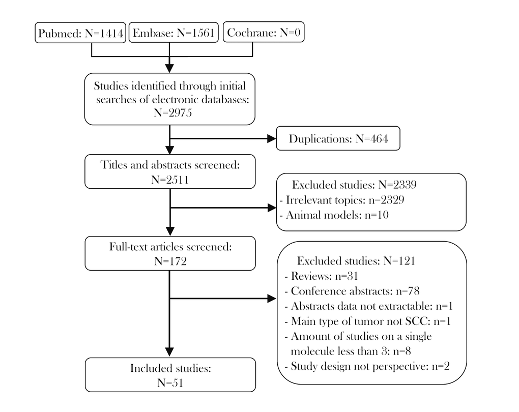 The exclusion criteria were: 1) reviews, meeting abstracts, letters; 2) animal model studies; 3) sample size < 30 patients; 4) insufficient data to estimate the HR and 95% CI; 5) the main type of tumor was not SCC; 6) the number of studies on a single molecule was less than three; and 7) the study design was not prospective.
