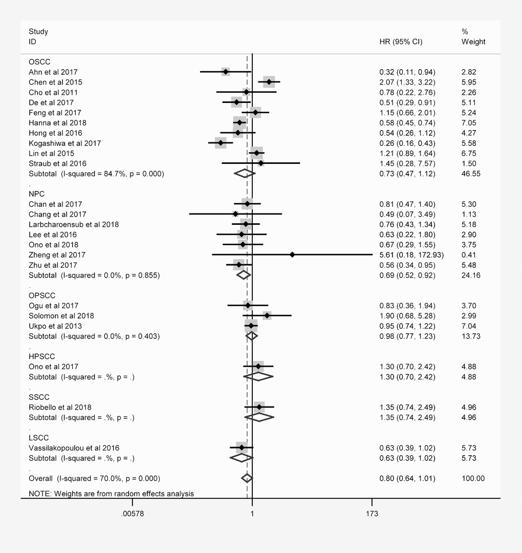 | Ukpo et al. 2013 [80] | PD-L1 | USA | Caucasian | OPSCC | 181 | 162/19 | > 5% | IHC | I-IV | OS DFS DSS | reported | P | 7 | ||||||||||||||||||||||||||||||||||||||||||||||||||||||||||||||||||||||||||||||||||||||