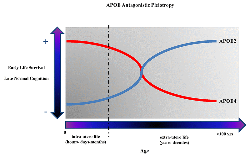 Studies on the impact of APOE polymorphism on various clinical outcomes in full-term normal neonates and infants are rare [119–121]. However, some investigations performed on selected types of neonate populations, suggest that APOE has indeed AP features. In fact, an over-representation of APOE 4/4 and 2/4 with a reduction in APOE 2/3 and 3/3 when compared with adult population [122] suggests that APOE4 is related to an increased risk of premature death. Furthermore, data from the same group of investigators found an over-representation of APOE2 in perinatal deaths populations [123]. This apparent paradoxical inversion of the protective effect of APOE2 vs. APOE4 in neonates, in contrast with the findings observed in elders, fits very well with the hypothesis that APOE has indeed antagonistic pleiotropic properties across the entire human lifespan [67,124,125]. Nevertheless, considering that the distributions of APOE alleles in healthy general populations are linked to various types of factors such as ancestry, geography, etc. (see paragraph Genetic epidemiology), much larger population cohorts stratified by the “local” APOE frequencies (corrected for all other identified influencing factors) together with a more precise definition of the periods of life to consider (perinatal deaths can have different definition across different countries) and large multi-institutional collaborative investigations are necessary to expand our knowledge on the possible pre-natal or peri-natal effects of APOE on early life events as well as on later life physiological or pathological events.