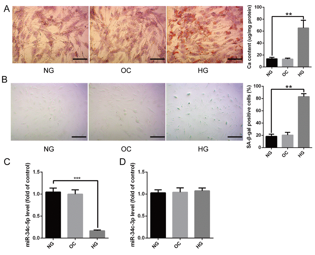 The expression of miR-34c-5p was decreased in high glucose-induced HA-VSMCs calcification/senescence