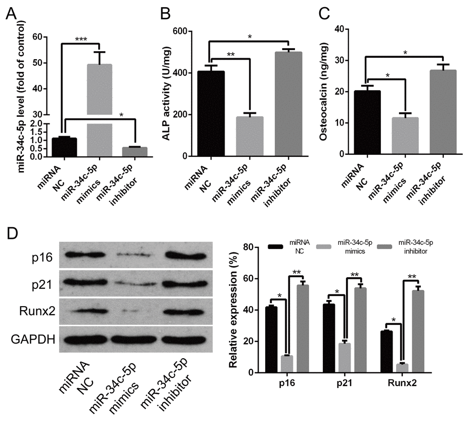 In order to demonstrate whether miR-34c-5p was involved in regulating calcification/senescence of HA-VSMCs, the gain- and loss-of-function approach were used to overexpress or inhibit the expression of miR-34c-5p, respectively. MiR-34c-5p mimics and inhibitor were transfected into HA-VSMCs to overexpress or inhibit expression of miR-34c-5p. The qRT-PCR results showed that the miR-34c-5p mimics induced miR-34c-5p levels by about 50-fold and the miR-34c-5p inhibitor decreased the expression of miR-34c-5p significantly (Figure 2A). Meanwhile, the ALP activity, OC secretion, and Runx2 protein levels were significantly decreased when overexpressing miR-34c-5p, whereas the opposite occurred when inhibiting its expression (Figure 2B–2D). In addition, the overexpression of miR-34c-5p significantly decreased the level of senescence markers p16 and p21 proteins, whereas inhibiting the expression of miR-34c-5p produced the opposite results (Figure 2D). Therefore, these data indicated that miR-34c-5p plays a negative role in the process of calcification/senescence of HA-VSMCs.