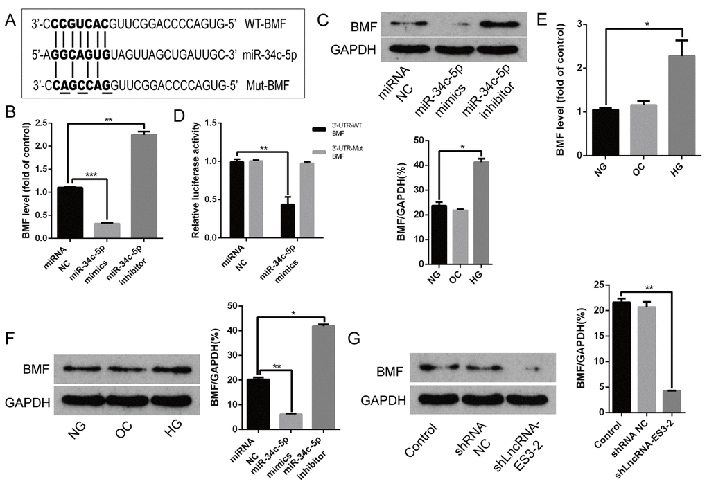 Bioinformatics analysis showed that the 3’UTR region of BMF was predicted to contain some potential binding sites for miR-34c-5p (Figure 4A). In cultured HA-VSMCs, overexpression of miR-34c-5p significantly reduced both the mRNA and protein level of BMF, while miR-34c-5p inhibitor dramatically increased them (Figure 4B and 4C). The following luciferase assay demonstrated that enforced expression of miR-34c-5p markedly suppressed the luciferase activity of WT-BMF reporter, while no change was observed in the luciferase activity of Mut-BMF reporter after miR-34c-5p overexpression (Figure 4D). In addition, in cultured HA-VSMCs, qRT-PCR assay revealed that the expression of BMF was markedly increased in HA-VSMCs induced by HG compared with NG (Figure 4E). Western blot demonstrated that HG also induced BMF protein level in HA-VSMCs (Figure 4F). Nevertheless, OC had no effect on both the level of mRNA and protein of BMF. Thus, the expression trend of BMF was consistent with that of lncRNA-ES3 in HA-VSMCs under HG. Western blot further showed that silencing of lncRNA-ES3 prominently inhibited BMF expression (Figure 4G). Collectively, these data indicated that BMF was the target of miR-34c-5p and that lncRAN-ES3 acted as a ceRNA of miR-34c-5p to regulate expression of the target gene, BMF, in HA-VSMCs.