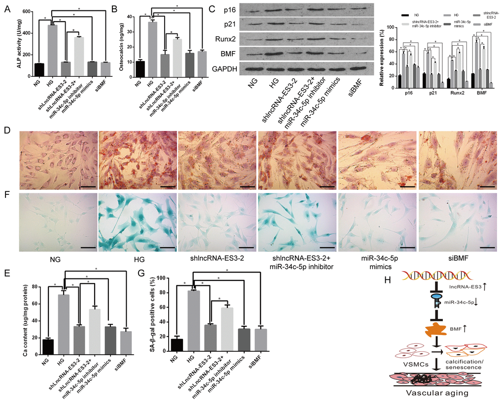 In the present study, we found that BMF was the target gene of miR-34c-5p, and that lncRNA-ES3 also had some complementary sites for miR-34c-5p. Thus, we aimed to further explore the underlying roles and molecular mechanisms of lncRNA-ES3/miR-34c-5p/BMF in VSMCs calcification/senescence and expected to discover potential therapeutic targets for diabetic vascular aging.