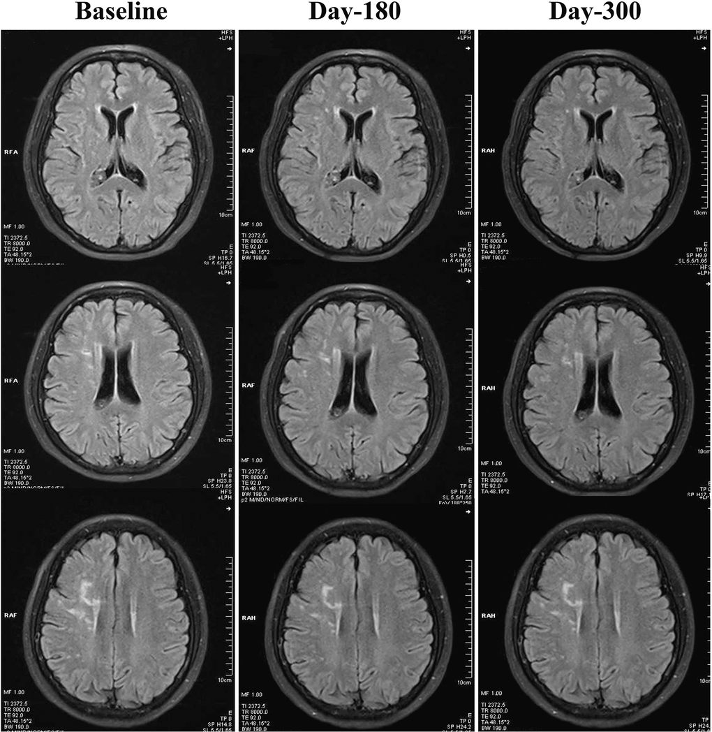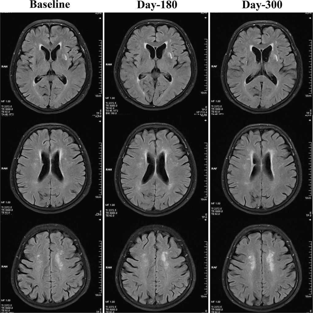 We measured the change of WMHs on T2 FLAIR sequences, estimated by the Fazekas scale and Scheltens scale (significant level α was defined as 0.25 for each scale), the alterations of cognition assessed by the MMSE and MoCA, and clinical symptoms such as headache, dizziness and sleeping disorder, at baseline and at 180-day and 300-day follow-ups.