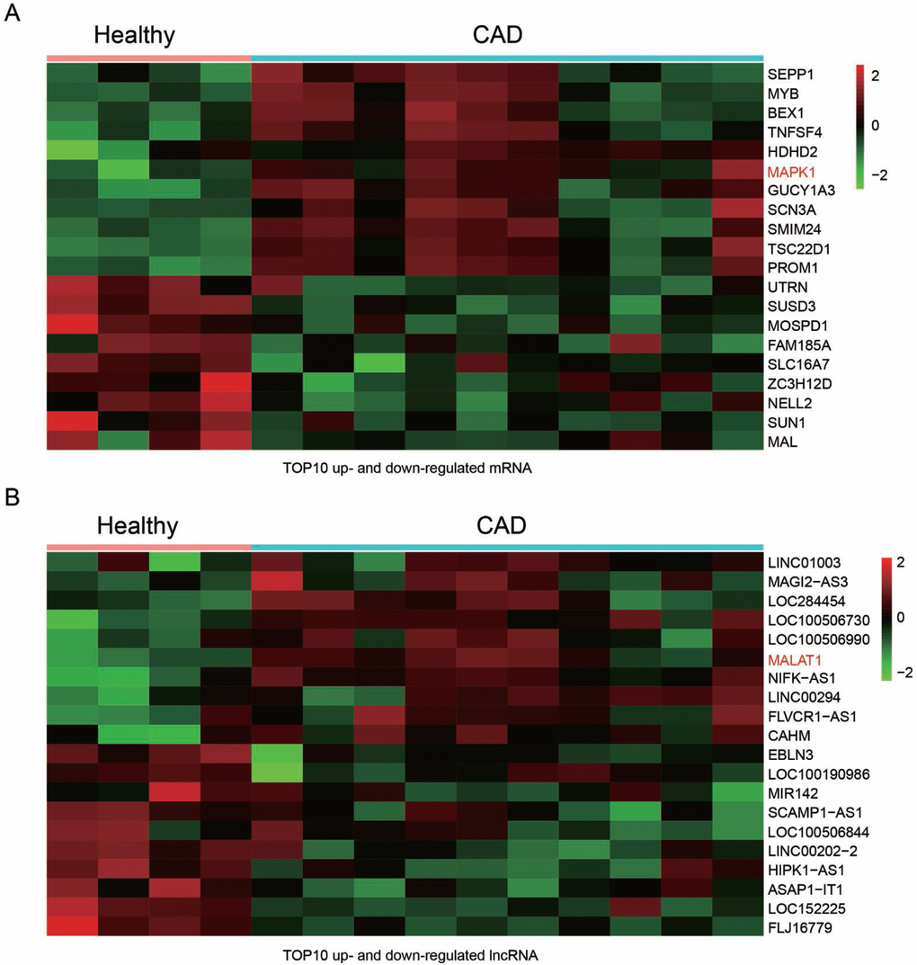 The GSE18608 data was analyzed. There were 14 samples including 10 CAD blood samples (CAD group) and 4 healthy blood samples (Healthy group). The differentially expressed mRNAs and lncRNA were chosen under the screening norm of fold change (FC) >2 and P <0.05. Totally, 55 differentially expressed mRNAs and 108 differentially expressed lncRNAs were respectively identified. The top ten up and down-regulated mRNAs were selected to draw the cluster heat map (Figure 1A), including mRNA MAPK1. Similarly, the top ten differentially expressed lncRNAs were illustrated in heat map (Figure 1B). In addition, MALAT1 was among the up-regulated lncRNAs.
