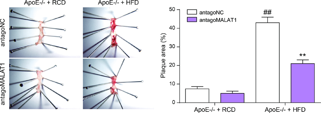 Six-week old male ApoE−/−mice (C57BL/6J, n=20) were purchased from HFK bioscience company (Beijing, China) were maintained at 22 ± 2 °C, relative humidity 55% ± 5% with a 12 hours light/dark cycle. After fed with a rodent chow diet (RCD, 4.5% fat) for a week, ApoE−/− mice were divided into two groups. 10 mice were fed with western diet (HFD, 21 % fat, 1.25 % cholesterol; HFK bioscience) for 12 weeks while another 10 mice were fed with rodent chow diet for 12 weeks. In different feeding groups, mice were then randomized into 2 groups (n=5 mice, respectively): antagoMALAT1-injected and control group. The mice received tail vein injections of 25mg/kg antagoMALAT1 (GenePharma, Shanghai, China) or antagoNC once per week for 4 weeks. After fasting for 6h, mice were euthanized and blood samples from heart and aorta were collected for further analyses. All animal experiments were performed under the protocol approved by the Institutional Animal Care and Use Committee of the Central South University.