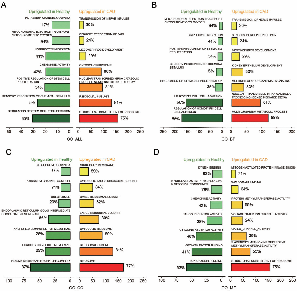 The key pathways that could affect CAD were testified through analysis of GO term enrichment, on the basis of chosen mRNAs that were differentially expressed. According to the enrichment result based on the GSEA reports, We illustrated top seven pathways after enrichment analysis with GO_Biological process (GO_BP), GO_Cellular Component (GO_CC), GO_Molecular Function (GO_MF) for further research on CAD (Figure 2A–2D). As to biological process, the up-regulated genes obtained a significant enrichment in transmission of nerve impulse, sensory perception of pain, mesonephros and kidney epithelium development, etc (Figure 2B). While for cellular component, the over-expressed genes enriched significantly in microbody membrane, large ribosomal subunit, ribosome, cytosolic ribosome, etc (Figure 2C). In regards to molecular function, the up-regulated genes obtained a significant enrichment in gated channel activity, structural constituent of ribosome, protein methyltransferase activity, etc (Figure 2D).