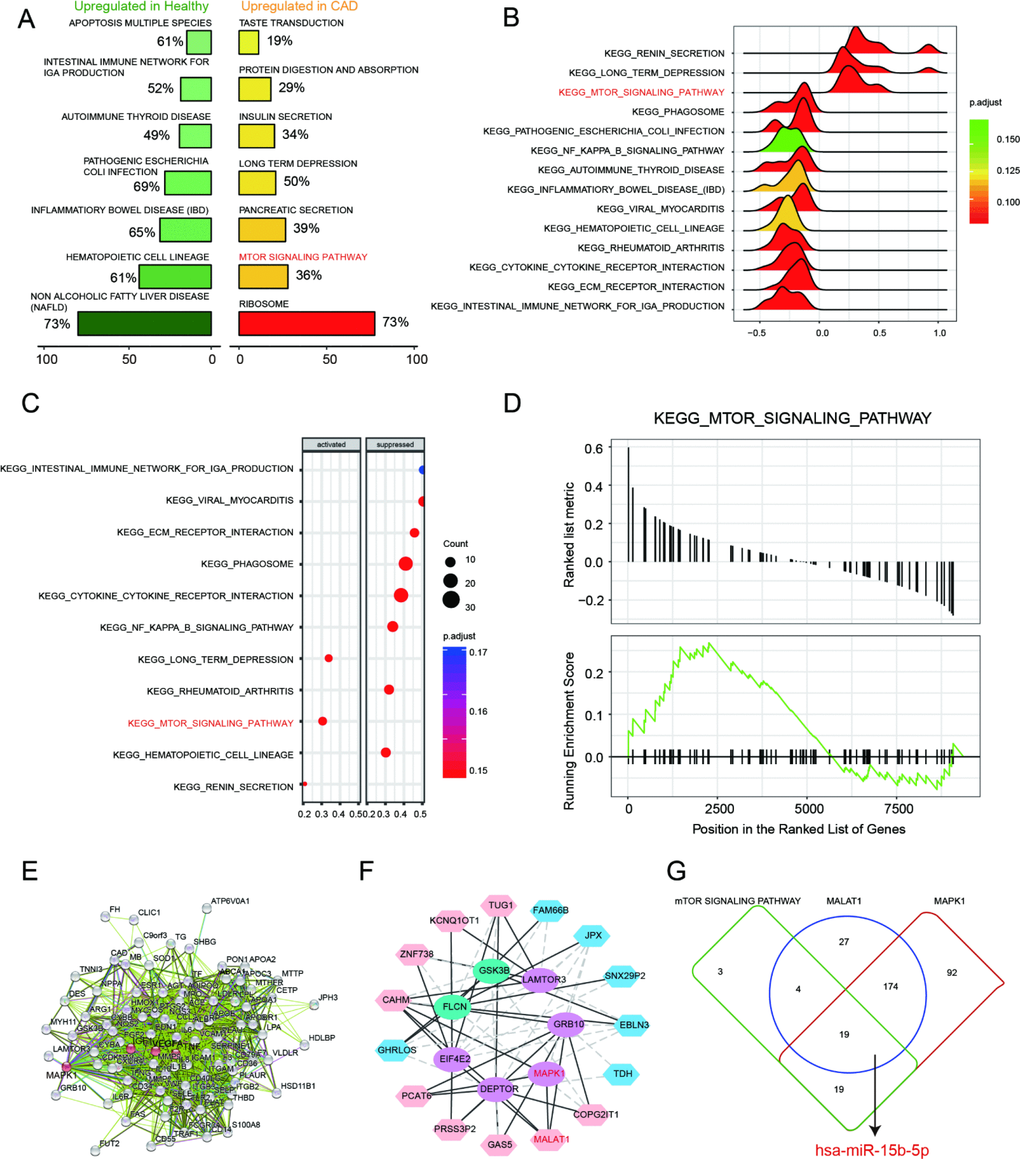 Based on the enrichment result from GSEA report, top 7 scored KEGG pathways in healthy or CAD blood samples were illustrated in Figure 3A. The over-expressed genes enriched in taste transduction, protein digestion and absorption, insulin secretion, long term depression, pancreatic secretion, mTOR signaling pathway and ribosome. We discovered that mTOR signaling pathway was activated in CAD blood samples. In addition, 14 KEGG pathways were observed in joy-plot, including 3 suppressed pathways and 11 activated pathways, and mTOR signaling pathway belonged to those activated pathways (Figure 3B). The dot-plot of KEGG pathway also illustrated that mTOR signaling pathway was one of the three pathways activated in CAD blood samples (Figure signaling pathway belonged to those activated pathways (Figure 3B). The dot-plot of KEGG pathway also illustrated that mTOR signaling pathway was one of the three pathways activated in CAD blood samples (Figure 3C). Further, GSEA enrichment result illustrated that most of genes, associated with mTOR signaling pathway, were revealed in the region where genes were enhanced in CAD (Figure 3D), which indicated that mTOR signaling pathway was activated in CAD.