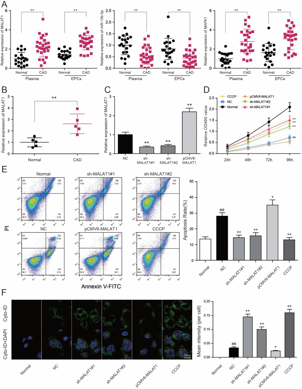 The transfection experiment was performed at Day 5 after initial plating. The sequences were desired by Sangon Biotech (Shanghai, China). Negative control (NC), miR-15b-5p mimics, miR-15b-5p inhibitor, sh-MALAT1#1 (5’-GCAGCCCGAGACTTCTGTAAA-3’), sh-MALAT1#2 (5’-GCCCGAGACTTCTGTAAAGGA-3’), pCMV6-MALAT1 or pCMV6-MAPK1 were transfected into mixed cortical cultures using LipofectamineTM 3000 according to the manufacturer’s instructions. The transfected cells were collected after 48 h for further experiments. EPCs were generally assigned to different groups as follows: normal group (healthy EPCs), NC group (cells transfected with no sense oligonucleotide sequence), sh-MALAT1#1 group (cells transfected with sh-MALAT1#1), sh-MALAT1#2 group (cells transfected with sh-MALAT1#2), pCMV6-MALAT1 group (cells transfected with pCMV6-MALAT1), CCCP group (Carbonyl cyanide 3-chlorophenylhydrazone, Sigma, Buenos Aires, Argentina), miR-15b-5p mimics group (cells transfected with miR-15b-5p mimics), miR-15b-5p inhibitor group (cells transfected with miR-15b-5p inhibitor), miR-15b-5p inhibitor + sh-MALAT1#1 group (cells co-transfected with miR-15b-5p inhibitor and sh-MALAT1#1), miR-15b-5p + pCMV6-MALAT1 group (cells co-transfected with miR-15b-5p mimics and pCMV6-MALAT1), pCMV6-MAPK1 group (cells transfected with pCMV6-MAPK1), miR-15b-5p mimics + pCMV6-MAPK1 group (cells transfected with miR-15b-5p mimics and pCMV6-MAPK1).