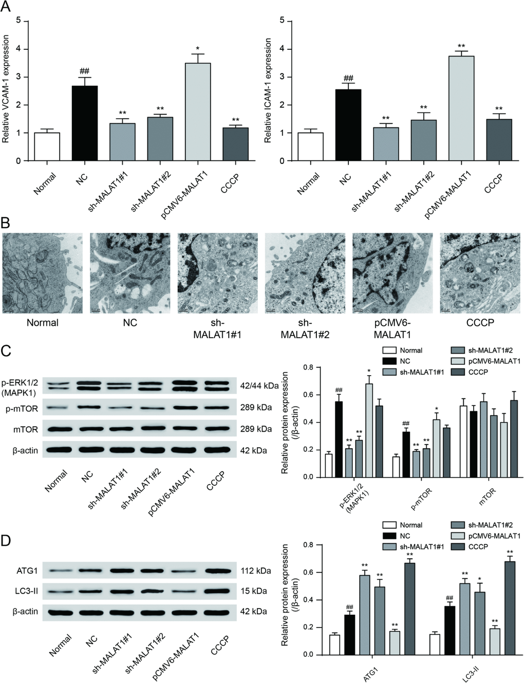 To testify the expression of MALAT1, miR-15b-5p and MAPK1, qRT-PCR was performed and the results illustrated that MALAT1 and MAPK1 expression in CAD blood samples and EPCs were significantly up-regulated while miR-15b-5p was conspicuously down-regulated (P<0.01, Figure 4A). Then we selected 5 CAD samples and 5 healthy samples (EPCs) for further experiments. Similarly, MALAT1 expression was significantly up-regulated in these 5 EPC samples from CAD patients than that in 5 EPC samples form healthy people (P<0.01, Figure 4B). EPCs transfected with either sh-MALAT1#1 or sh-MALAT1#2 exhibited lower level of expression compared to NC group while pCMV6-MALAT1 group had a higher expression level (P<0.01, Figure 4C). And expression level of sh-MALAT1#1 group was even lower than sh-MALAT1#2 group. MTT assay revealed that sh-MALAT1#1 promoted cell viability of CAD EPCs obviously whereas sh-MALAT1#2 and CCCP also facilitated cell viability (P<0.01, Figure 4D). Simultaneously, the results showed that there was conspicuous difference of cell viability between normal (healthy EPCs) and NC (CAD EPCs) groups (P<0.01, Figure 4D). Results of FCM assay verified that apoptosis rate in NC group was higher than that in normal group (P<0.05, Figure 5E), sh-MALAT1#1, sh-MALAT1#2 and CCCP had an effect of depression on cell apoptosis rate in EPCs (P<0.01, Figure 4E). And sh-MALAT1#1 appeared to be more effective compared with sh-MALAT1#2. The apoptosis rate in pCMV6-MALAT1 group was higher than that in NC group (P<0.05, Figure 4E). Autophagy assay exhibited that there was almost no autophagy in normal group. Sh-MALAT1#1, sh-MALAT1#2 and CCCP had an effect of promoting on cell autophagy in EPCs comparing with NC groups and sh-MALAT1#1 had a better effect than sh-MALAT1#2 (P<0.05, P<0.01, Figure 4F). CAD markers VCAM-1 and ICAM-1 [41, 42] were detected by qRT-PCR and the results showed VCAM-1 and ICAM-1 expression in NC group were higher than that in normal group. Besides, sh-MALAT1#1, sh-MALAT1#2 and CCCP could significantly down-regulate VCAM-1/ICAM-1 expression (P<0.05, P<0.01, Figure 5A). Transmission electron microscope assay showed that autophagosome in sh-MALAT1#1 or, sh-MALAT1#2 and CCCP group was more than in NC group (Figure 5B). To determine whether MALAT1 can activate mTOR signaling, we first detected the upstream modulators ERK1/2 under different conditions by western blot. Western blot results exhibited p-ERK1/2 (MAPK1), p-mTOR expressions were promoted by pCMV6-MALAT1 while they were inhibited by sh-MALAT1#1 or sh-MALAT1#2. There was no significant change between CCCP group and NC group (P<0.05, P<0.01, Figure 5C). In addition, we detected ATG1 which was down-stream protein of mTOR and related to autophagy process. Furthermore, autophagy positive marker LC3-II was also detected. The result showed that ATG1 and LC3-II were highly expressed in sh-MALAT1#1, sh-MALAT1#2 and CCCP group while lowly expressed in pCMV6-MALAT1 group (P<0.05, P<0.01, Figure 5D). Therefore, sh-MALAT1#1 was chosen to be used in the following experiments. Consequently, both sh-MALAT1#1 and sh-MALAT1#2 can facilitate cell viability and cell autophagy while restrain cell apoptosis. In other words, lncRNA MALAT1 strengthens CAD progression.