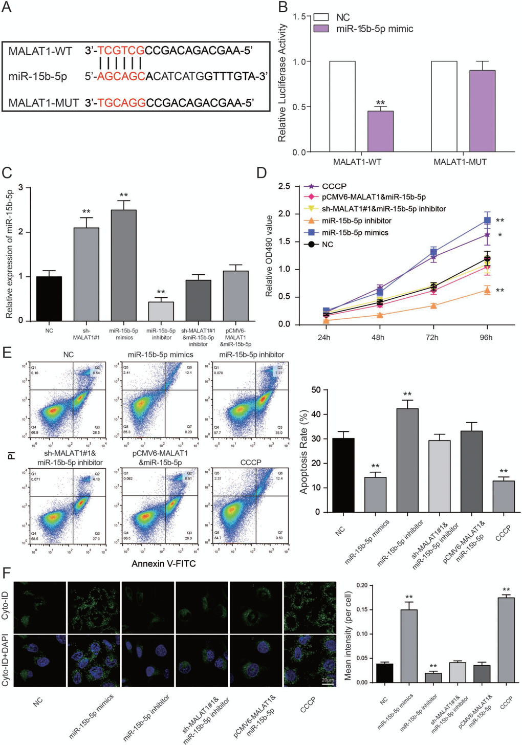 The binding site between MALAT1 and miR-15b-5p was shown in Figure 6A. We performed a luciferase reporter assay to validate the transcriptional regulation of miR-15b-5p on MALAT1. We found that co-transfection of MALAT1 wild type and miR-15b-5p mimics decreased luciferase activity as compared with miR-NC group and MALAT1 mutant type group (P<0.01, Figure 6B). The results indicated that miR-15b-5p served as a target of MALAT1. Furthermore, miR-15b-5p expressions of sh-MALAT1#1 group and miR-15b-5p mimics group were obviously raised while low expression was detected in the miR-15b-5p inhibitor group. MiR-15b-5p inhibitor + sh-MALAT1#1 group and miR-15b-5p + pCMV6-MALAT1 group presented the same expression level as NC group (P<0.01, Figure 6C). After MTT assay, cell viabilities of CCCP group and miR-15b-5p mimics group were enhanced. In contrast, miR-15b-5p inhibitor group was suppressed. Meanwhile, cell viabilities of miR-15b-5p inhibitor + sh-MALAT1#1 group and miR-15b-5p + pCMV6-MALAT1 group were practically equal to NC group (P<0.05, P<0.01, Figure 6D). The results of FCM assay proved that the rate of cell apoptosis in CCCP group and miR-15b-5p mimics group were remarkably lower than other groups. Apoptosis rate in miR-15b-5p inhibitor group was the highest and the one in miR-15b-5p inhibitor + sh-MALAT1#1 group and miR-15b-5p + pCMV6-MALAT1 group was practically equivalent to NC group (P<0.01, Figure 6E). The results of autophagy assay proved that the cell autophagy in CCCP group and miR-15b-5p mimics group were remarkably higher than other groups. Autophagy in miR-15b-5p inhibitor group was the lowest and the one in miR-15b-5p inhibitor + sh-MALAT1#1 group and miR-15b-5p + pCMV6-MALAT1 group was practically equivalent to NC group (P<0.01, Figure 6F). Based on the experiments mentioned above, lncRNA MALAT1 can target miR-15b-5p to promote cell apoptosis and suppress the cell autophagy.